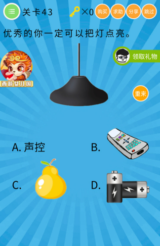 微信上的史上最囧挑战第六季是一款解谜游戏,玩家需要完成关卡的题目方能通过关卡。在该游戏的第43关,它给出的题目是:优秀的你一定可以把灯点亮。下面是这一关的攻略。史上最囧挑战第六季第
