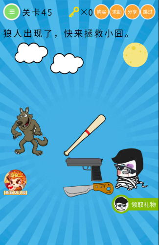 微信上的史上最囧挑战第六季是一款解谜游戏,玩家需要完成关卡的题目方能通过关卡。在该游戏的第45关,它给出的题目是:狼人出现了,快来拯救小囧。下面是这一关的攻略。史上最囧挑战第六季第