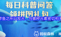 带鱼之所以发光,与哪种元素密切相关?支付宝蚂蚁森林神奇海洋2025年8月22日问题已经更新,今日正确答案是:【磷】。带鱼常吃一些含有发光菌群的藻类,这些藻类在带鱼体内会发出荧光。此