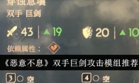 恶意不息双手巨剑攻击模组选什么?恶意不息里面很多人都想要玩下这个双手巨剑了呢,那么就需要知道下攻击模组的搭配了,现在的尸水染挥刀太慢了,打起来很费力啊,就想要玩下纯点的力量,那么大