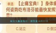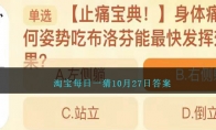 身体痛时用何姿势吃布洛芬能最快发挥效果?这是2023年淘宝大赢家10月27日活动题目,进入到淘宝首页二楼找到大赢家进入可参与答题,回答正确后第二天登录就能领取到免费的红包奖励,小编