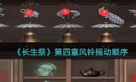 国风悬疑解谜游戏《长生祭》已经上线,很多小伙伴想知道第四章风铃怎么摇动呢? 下面是3DM小编给大家带来的《长生祭》第四章风铃摇动顺序介绍,感兴趣的小伙伴们一起来看看吧。>&g