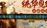 无悔华夏最近上线了全新的渔樵问答活动,很多小伙伴都很想知道渔樵问答4月12日的答案是什么,今天小编给大家带来了《无悔华夏》渔樵问答4月12日答案一览。感兴趣的小伙伴一起来看看吧。