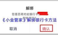 打开小金管家,点击“钱包”页面,再进入“银行卡”页面,选择需解绑的银行卡,点击“解绑”按钮,按提示输入银行卡相关信息验证身份,验证通过后即可完成解绑,解绑成功后该银行卡将不再由小金