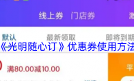 打开光明随心订APP,进入“我的”页面后点击“优惠券”,选择想要使用的优惠券并点击“去使用”,即可在选购商品时自动抵扣相应金额。若在线下门店使用,则需点击“查看券码”-“门店核销”