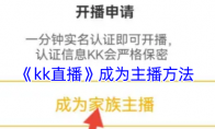 想要成为KK直播的主播,其实步骤相当简洁明了。你只需打开KK直播APP,进入“我的”个人页面,然后点击页面上的“我要成为主播”按钮。接着,选择“成为家族主播”这一选项,并按照页面上
