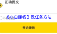 打开小白赚钱APP后进入任务大厅,浏览各类悬赏任务(如下载注册、应用试玩、问卷调查等),选择感兴趣的任务后按要求完成操作(如截图、填写信息、体验指定时长等),最后提交审核通过即可获