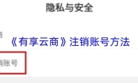 打开有享云商APP进入“我的”页面,点击右上角“设置”按钮,在设置页面选择“隐私与安全”选项,进入后点击“永久注销账号”,在弹出的界面阅读注销条款并点击“确定”,即可完成账号注销申