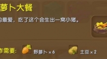 野萝卜大餐,这个合成出来就不是给我们准备的了,而是给我们饲养的小猪吃,只要喂了这个,就可以让猪生小猪了。不过,很好奇就养了一只猪的话,能不能靠这个生小猪呢?野萝卜大餐 【合成需要】