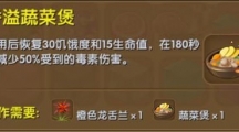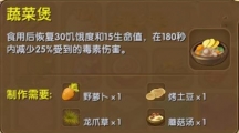 蔬菜煲,有多种蔬菜混合起来的鲜汤,30点饥饿度就可以看出这个蔬菜煲也是较为高级的食材了,25%毒素伤害作用一般,剧毒这种东西遇到比较少。蔬菜煲 【合成需要】胡萝卜X1、烤土豆X1、
