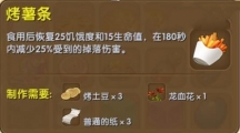 这次介绍是快餐店中的经典食物烤薯条,25饥饿度和15生命值,非常不错。不过25%的掉落伤害就聊胜于无了,基本没什么场合需要,没有这个效果也没什么。烤薯条 【合成需要】烤土豆X3、龙