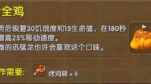 《迷你世界》中的烤全鸡,绝对是算得上合成制作上很有槽点的食材,6个鸡腿合成一只烤全鸡,这绝对不是普通的鸡吧!玩家吃的话就是饥饿度30点回复和生命值,不过在文字说明中可以看出迅猛龙也