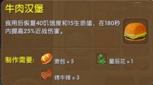 吃了牛肉汉堡,更有劲了,腰不酸腿不痛。40的饥饿度,绝对称得上少有,而且还加25%的近战伤害,强力食材,砍怪前带个牛肉汉堡,想想就觉得带感。牛肉汉堡 【合成需要】麦包X5、星辰花X