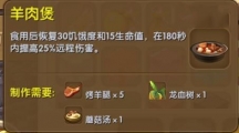 羊肉煲,是食材中少有的远程buff。加25%的远程伤害,对喜欢远程武器的小伙伴提升很大,而且30点饥饿度,也称得上优质食材,出门带上几锅吧。羊肉煲 【合成需要】烤羊腿X5、龙血树X