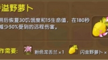 香溢野萝卜在和远程怪物战斗的时候是神器,l非常强势的减伤效果,50%的减伤,可以默认自己的血量是翻倍了。而且在常规食用上,香溢野萝卜的效果也非常不错。香溢野萝卜 【合成需要】粉色龙