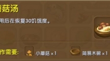 蘑菇汤也是在出门在外的时候,很棒的饥饿度补给。能恢复30饥饿度,比面包高了一点。建议小伙伴根据自己的作物来决定自己哪个食物作为自己的主粮。蘑菇汤 【合成需要】小蘑菇X1、简易木碗X