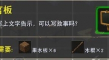 留言板是在《迷你世界》中非常有趣的道具,可以发布告示一样写上自己的话,然后插在自己想放的地方,下面就来看看留言板需要什么材料才能合成吧。留言板 【合成需要】果木板x6,木棍x2