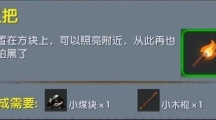 这次介绍的是必带系列——火把,在《迷你世界》中在黑暗中用来照亮附近的道具。不管是出门还是干什么都在身上都要带上火把。下面就来看看火把合成表图鉴吧。火把 【合成需要】小煤块x1、小木