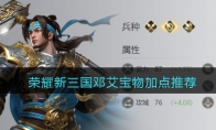 荣耀新三国游戏中邓艾加点推荐:武力 22.54%、智力 7.03%、统率 65.96%、先攻 4.47%。宝物推荐:潜龙铠、覆舟铁鞭、先锋铠、凤嘴刀荣耀新三国邓艾宝物加点推荐邓艾攻