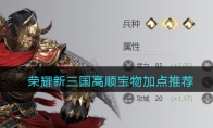 荣耀新三国游戏中高顺加点推荐:武力 76.87%、智力 1.17% 、统率 17.48% 、先攻 4.48%。宝物推荐:陷阵兵符、百炼刀、覆舟铁鞭、镔铁斧。荣耀新三国高顺宝物加点推