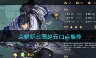 荣耀新三国手游中赵云加点推荐武力为主:武力 89.69%、智力 0.47%、统率 0.67%、先攻 9.17%。白马银枪的赵云,左执涯角枪,右使青釭剑,长板坡前七进七出的画面早已在