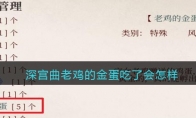 深宫曲游戏中老鸡的金蛋自己吃了没事,还会增加某些属性,但是如果作为礼物送给别的妃子,那么不仅可以涨对方的好感度,还能减少对方的某一项属性! 深宫曲老鸡的金蛋吃了会怎样老鸡的金蛋送妃