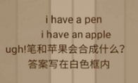 答案是apple pen,移动标题中这俩单词到白色框里即可通关。问题:第七十七关,i have a pen,ihave an apple ugh!笔和苹果会合成什么,答案写在白色框