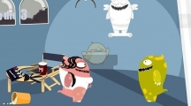 《100种蠢蠢的死法3》第35关是不是很熟悉?《电锯惊魂》大家肯定都知道,这一关有不少这部电影的元素在里面。让我们看一下这一关蠢蠢是怎么挂的吧。第35关 们要 先将最右侧的面具移