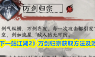 在《下一站江湖2》中,地级剑护身绝技“万剑归宗”可通过归墟剑宗亲传弟子兑换或武学参悟获取。其效果为攻击时33%概率触发4把飞剑,每把造成刚属性1.2倍伤害,且每次释放飞剑可叠加自身