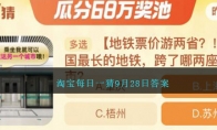 我国最长的地铁,跨了哪两座城市?这是2023年淘宝大赢家9月28日活动题目,参与淘宝大赢家活动进行答题,回答正确后第二天登录就能领取到免费的红包奖励,小编给大家带来了9月28日淘宝