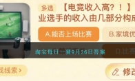电竞职业选手的收入由几部分组成?这是2023年淘宝大赢家9月26日活动题目,参与淘宝大赢家活动进行答题,回答正确后第二天登录就能领取到免费的红包奖励,小编给大家带来了9月26日淘宝