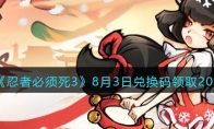 忍者必须死3游戏2023年8月3日兑换码是:武道大会龙腾虎跃。游戏中大家可以使用兑换码领取免费的福利,目前官方已经发放了不少新兑换码,想要领取2023年8月3日忍者必须死3兑换码的