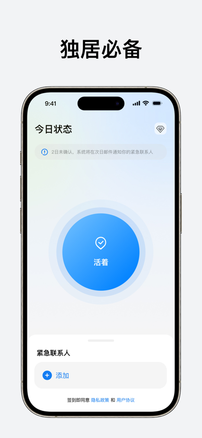 活着么是一款为你"解决"生存"终极大事"的创意恶搞神器!它的使命简单却意义非凡,并非是为了无端介入你的生活轨迹,而是如同黑暗中的一道微光,在你遭遇突发状况,陷入无法言语、无法自主求助的绝境时,毫不犹豫地挺身而出。它会迅速且精准地向外界传递出你的求救信号,替你向这个世界发出最急切的呼喊,让关怀与援助能够及时抵达你身边,成为你在独居生活中最坚实的后盾。