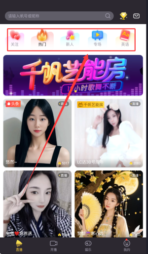 4、直播板块提供关注主播、热门内容、新人推荐及主题专场分类浏览。