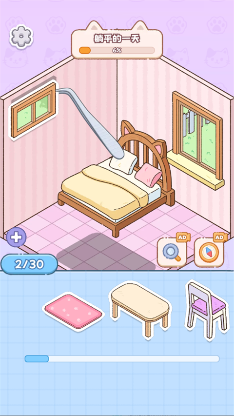 1、进入游戏后,拿起你的小镊子,把各种各样的家具和物品贴到它们该去的地方。
