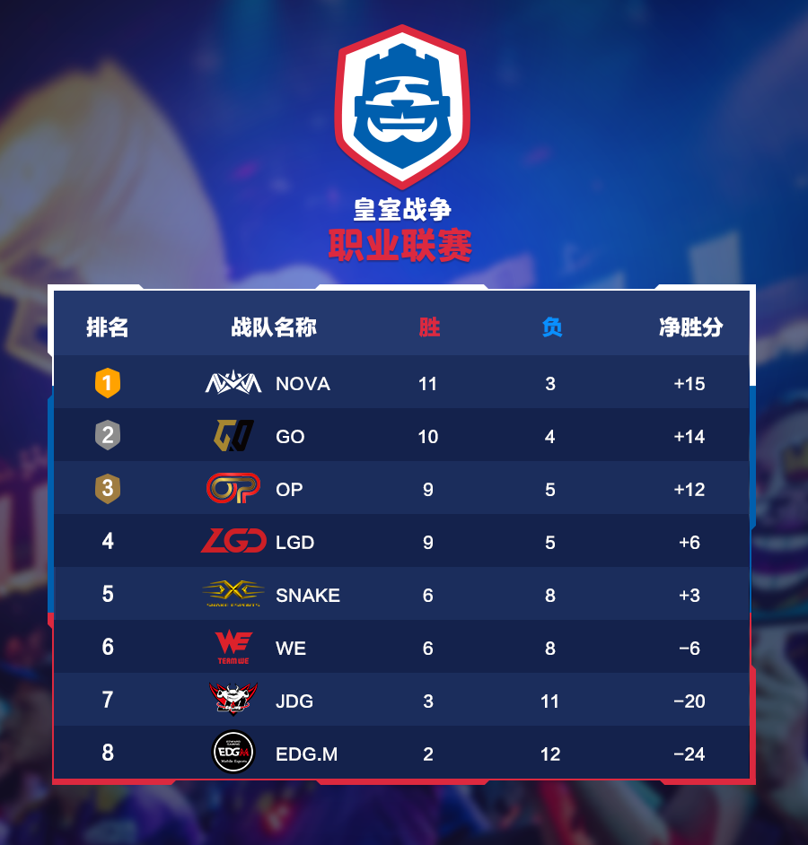 经过9周的14轮鏖战,CRL春季赛决出了最后晋级季后赛的4支队伍——皇室霸主NOVA,阵容豪华的GO,主场作战的OP以及老牌豪门LGD脱颖而出。而SNAKE、WE、JDG和EDG则遗憾出局,等待秋季赛卷土重来。8大战队的最终排名,也基本符合赛季初的预判。游戏熟悉程度、资金投入、圈内资源成为左右各大战队成绩的重要砝码。