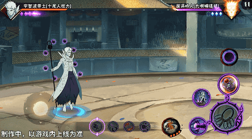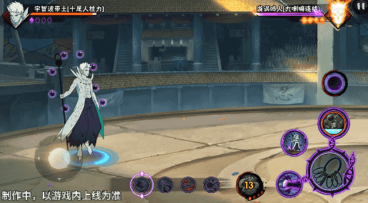 十尾带土可以使用以阴阳遁为基础的求道玉,求道玉可以变化成各种形态,求道玉的攻击还可以降低敌人的血量上限,并且让敌人无法恢复血量,兼具破坏力和防御力。屏幕下方的4个图标分别代表十尾带土普攻的后4A,每按一次普攻,光圈都会圈中下一段即将释放的普攻(即会跳至当前一A的下一A),登场时默认光圈在2A位置,完整使用完一套普攻后光圈回归初始位,若在普攻过程中停手,则光圈跳动停止,再次进行普攻后光圈会重新跳动轮转。