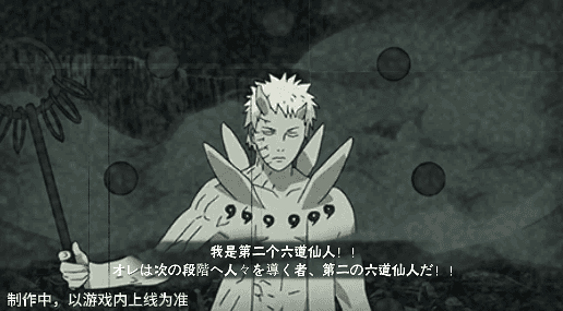 释放奥义,十尾带土使用六赤阳阵将敌人困在场内,召唤出神树的一部分,随后球同时朝四个方向飞出。期间带土会飞向空中使用求道玉包裹自己,免受伤害。奥义为中场全屏,建议在斩杀时使用。