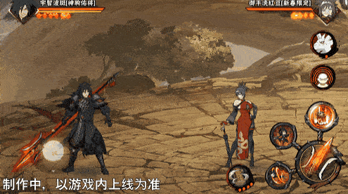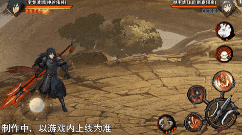 释放一技能,神驹斑手持附着火遁的长戟突刺钻击前方敌人,并附加灼烧效果。