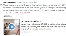 网易官方推特今天公布网易游戏将于CCP合作开发一款全新的手游,《EVE:银河计划》(EVE:Project Galaxy),这款游戏使用ARKit 2打造。网易称他们计划将《EVE