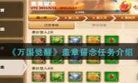 国觉醒盖章留念任务有哪些?在游戏内很多玩家都想知道,盖章留念具体有哪些任务。下面就让小编给大家带来《万国觉醒》盖章留念任务介绍,感兴趣的玩家一起来看看吧。《万国觉醒》盖章留念任务介绍1、第一天:登录游戏、野外探集、科技研究。2、第二天:行动力消耗、攻击野蛮人、提升战力。3、第三天:进攻城寨、联盟捐献帮助、提升建筑。4、第四天:使用加速道具、驿站购买、提升兵力。5、第五天:守护者符文、收购联盟礼物、收集城内资源。总结 1、每天的任务是不同的,完成任务之后,玩家可以得到奖励。2、本次活动的任务难度都是不高的,推荐玩家参加。以上就是《万国觉醒》盖章留念任务介绍的全部内容了,更多手游攻略请关注3DM手游网!