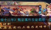 甘宁在建安十二年中是一名男性角色,很多小伙伴不清楚甘宁的技能、羁绊等等,下面小编就给大家介绍一下建安十二年的角色甘宁的技能、羁绊等等,下面小编给大家带来《建安十二年》甘宁属性技能羁绊一览,还不清楚的小伙伴赶紧来看看吧。>>《建安十二年》角色介绍汇总 《建安十二年》甘宁属性技能羁绊一览甘宁,字兴霸,东吴名将。甘宁年少时好游侠,纠集部众,抢夺船只财物,人称“锦帆賊”,青年时熟读诸子,停止劫掠。甘宁性格爽朗,勇敢坚毅,士卒多愿效死。曾以百骑夜袭曹营,迫使曹操退兵,皖城之战中,甘宁率部突袭,身先士卒,夺城擒将,陈寿称他为“江表之虎臣”。英雄技能:焚风 冷却时间:30秒能量消耗:2点甘宁挥舞大刀形成一股焚风,将周围敌军向自身拖拽,每秒造成97%攻击力的伤害,持续3秒。对较远的燃烧单位同样造成伤害并拖拽,在技