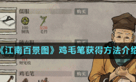 《江南百景图》游戏中鸡毛笔怎么获得?江南百景图苏州府探险第二章已经上线了,而鸡毛笔道具很多小伙伴表示不知道怎么获取,那么接下来小编为大家带来《江南百景图》鸡毛笔获得方法介绍,一起来看看吧。《江南百景图》鸡毛笔获得方法介绍一、获得方法 1、玩家可以在美鞋张的商店中兑换获得。二、花费 松果*18,华丽的鸡毛*1活力的鸡毛是从跑丢的大母鸡获得。三、大母鸡 1、在通贵狸过桥后七狸通货店的旁边。2、在杂货阿意的店右上角的一片山茶花丛中。3、在杂货阿意的店左上角围墙中,需要砍掉外面两棵树才能进去。4、在塔后面的空地上。5、迷宫的右下角,需要驱散迷雾,花点钱就好了。以上就是小编整理的关于《江南百景图》鸡毛笔获得方法介绍的全部内容,更多游戏攻略请持续关注3DM手游网!
