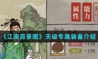 在江南百景图手游中天级专属装备是什么呢?游戏中的天级人物应该搭配什么样的珍宝会比较符合他的身份呢?那么想知道天级专属装备搭配的就跟随小编一起来看看吧。天级专属装备搭配1、沈周——龟壳2、唐伯虎——桃花枝3、武则天——凤凰4、汪直——火绳枪5、李清照——父乙彝(yi第二声)6、魏忠贤——竹筒7、黄道婆——黎锦8、王昭君——浑不似9、刘伯温——斩仙剑10、常遇春——虎头湛金枪11、白素贞——孝头髻(ji第四声)12、李时珍——湖神石13、沈括——透光镜14、玄奘——般若经15、包拯——虎头铡16、李白——李花枝17、秦桧——一桶青鱼18、董其昌——节寰剑19、文征明——银杯以上就是小编整理的江南百景图天级专属装备介绍,想知道更多相关资讯攻略的请关注3DM手游网。