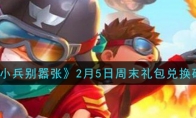 《小兵别嚣张》手游2月5日周末礼包兑换码是什么,在哪里领取呢?下面小编就给大家带来了《小兵别嚣张》2月5日周末礼包兑换码及领取地址方法介绍,想要领取的小伙伴一起来看看吧!>>>>《小兵别嚣张》礼包兑换码大全 《小兵别嚣张》2月5日周末礼包兑换码兑换码:JABRE 礼包码在哪领在邀请有礼界面填写礼包码即可领取对应的道具了!以上就是3DM小编整理带来的《小兵别嚣张》2月5日周末礼包兑换码,更多精彩内容,请点击关注3DM手游网,小编将持续为您更新!