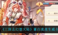 在三国志幻想大陆中很多小伙伴都很想知道游戏中董白的最新皮肤虎虎生威怎么获得,今天小编给大家带来了《三国志幻想大陆》董白虎虎生威介绍。感兴趣的小伙伴一起来看看吧,希望可以帮助到大家。《三国志幻想大陆》董白虎虎生威介绍1、皮肤立绘2、皮肤描述皮肤最具标志性的便是糖画小老虎,醒目的糖画元素辅以橙红色基调,正是为了表达年味与糖画之间的结合。董白头戴虎头帽,手持糖画棒,虎裘制成的可爱围巾衬托得董白更加活泼可爱。愿小将军们在即将到来的虎年里,生活甜似糖,事业如虎威!3、游戏实机图以上就是小编整理的关于《三国志幻想大陆》董白虎虎生威介绍的全部内容,更多游戏攻略请持续关注3DM手游网!