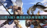 《三国志幻想大陆》游戏中新魏脏水阵容搭配武将豪刃曹操、雷霆赵云,于禁、乐进、诸葛果、曹丕。那么今天小编就给大家介绍一下三国志幻想大陆新魏脏水阵容玩法攻略,有需要的小伙伴不要错过了。 《三国志幻想大陆》新魏脏水阵容玩法攻略核心武将:豪刃曹操、雷霆赵云 豪刃曹操:传统脏水队的奠基人,到了新脏水中依然是不可撼动的核心武将。使用曹仁护法,只要有豪刃曹操在的阵容,坦度就有了保证。相比老脏水,少了专武曹操后debuff数量虽有减少,但算上神兵灵宠,依然可以达到 “7个” ,因此豪刃曹操仍然是阵容的主输出之一,不过更重要的是他贡献了全队的坦度。雷霆赵云:与老脏水不同,由于于禁乐进的加入,灭属性已经没有放弃的可能,刘备无法再成为下位替代,故必须上阵雷霆赵云。在有灭属性加持下的雷霆赵云,随着怒攻后的【龙鳞】堆叠,输出能力将会在第