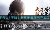 《不良人3手游》中有很多轶事任务需要玩家去完成,其中的断桥难复任务需要玩家名声达到31级之后,去孟婆那里的墙边找到守桥铁卫领取,之后帮铁卫找到快速修复的天宫盒,然后回去和铁卫进行对话提交即可完成,那么今天小编就给大家介绍一下不良人3手游断桥难复任务完成攻略,有需要的小伙伴不要错过了。 《不良人3手游》断桥难复任务完成攻略1、玩家的名声达到31级之后,去孟婆那里的墙边找到守桥铁卫; 2、任务内容需要我们前往洗剑池,帮铁卫找到快速修复的天宫盒; 3、洗剑池附近有“剑”的光标指引标识,玩家过去按照提示做任务; 4、然后只要回去和铁卫进行对话提交,就完成了。 以上就是《不良人3手游》断桥难复任务完成攻略,更多游戏攻略请持续关注3DM手游网!