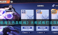 《航海王热血航线》游戏中的大熊试炼地狱模式是新上线的模式玩法,小伙伴都知道大熊试炼地狱模式怎么玩吗?今天小编就给大家介绍一下航海王热血航线大熊试炼地狱模式玩法介绍,有需要的小伙伴不要错过了。《航海王热血航线》大熊试炼地狱模式玩法介绍【玩法介绍】 1、我们在玩大熊试炼的时候,会根据玩家的等级划分战区,进入战区后就没有办法换了,每个战区里都有三个模式,分别是:简单、挑战和地狱模式;2、进入挑战会消耗1张试炼卷,每天会发放一张,可以最多积累到4张上线,每天可以购买2张试炼卷,然后用推荐的伙伴上场的话,可以增加掉落奖励,建议大家都带上;3、总共有5个boss和大熊本人,每次挑战完成后,可以从3个增益里选择一个,来强化我们的角色,更好的进行挑战,每天的积分会在当天结算,此时就不能继续挑战了,大家注意。以上就是小编整理的《