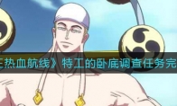 2021-07-22 阅读全文航海王热血航线特工的卧底调查任务怎么做?《航海王热血航线》游戏中特工的卧底调查任务是新上线的任务,那么怎么完成呢?今天小编就给大家介绍一下航海王热血航线特工的卧底调查任务完成攻略。 《航海王热血航线》特工的卧底调查任务完成攻略按照任务目标,寻找主岛A区鬼鬼祟祟的士兵,主岛前门附近神色慌张的士兵,正门前路上举止怪异的士兵位置如图 找到之后一一对话就行以上就是《航海王热血航线》特工的卧底调查任务完成攻略,更多游戏攻略请持续关注3DM手游网!